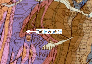 Sur le versant S-E de la Roche de Solutré, une faille liée à la tectonique tertiaire est bien visible et notée sur la carte géologique au 1/50000è. En 2019, la découverte d’un miroir (3 X 5 m) de cette faille par Pierre-Yves RABA nous permet de vérifier le mouvement en extension de cette faille. Une étude de terrain détaillée a permis de mesurer son rejet et de préciser les limites des différentes formations géologiques.