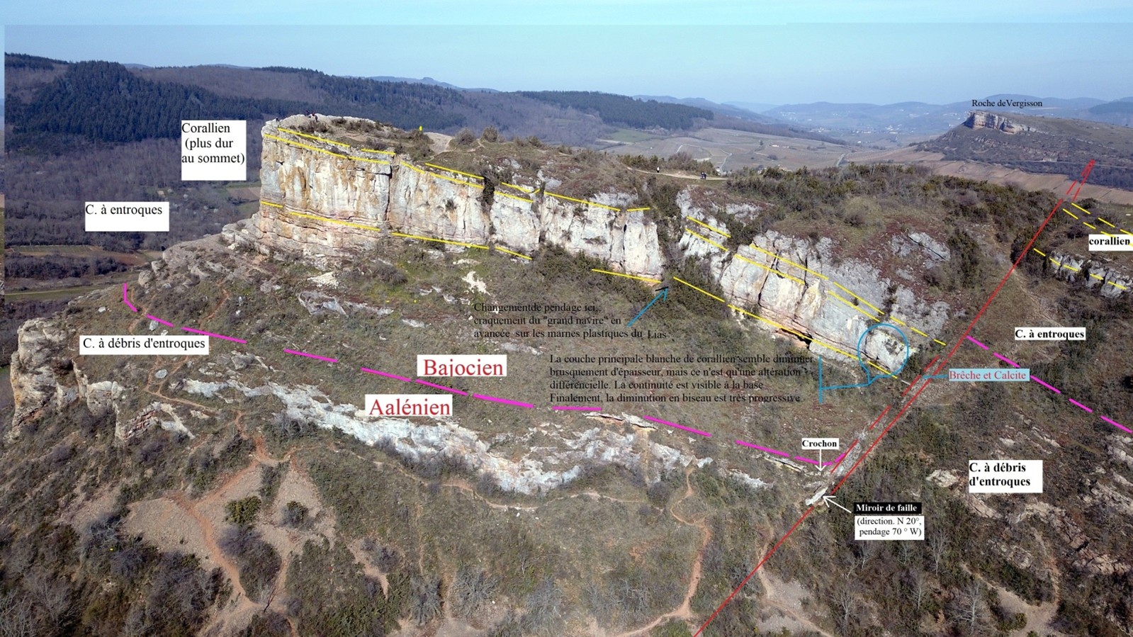 La découverte du miroir de cette faille et le relevé des formations géologiques de part et d’autre permet de confirmer cette hypothèse et nous pouvons présenter l’interprétation suivante :